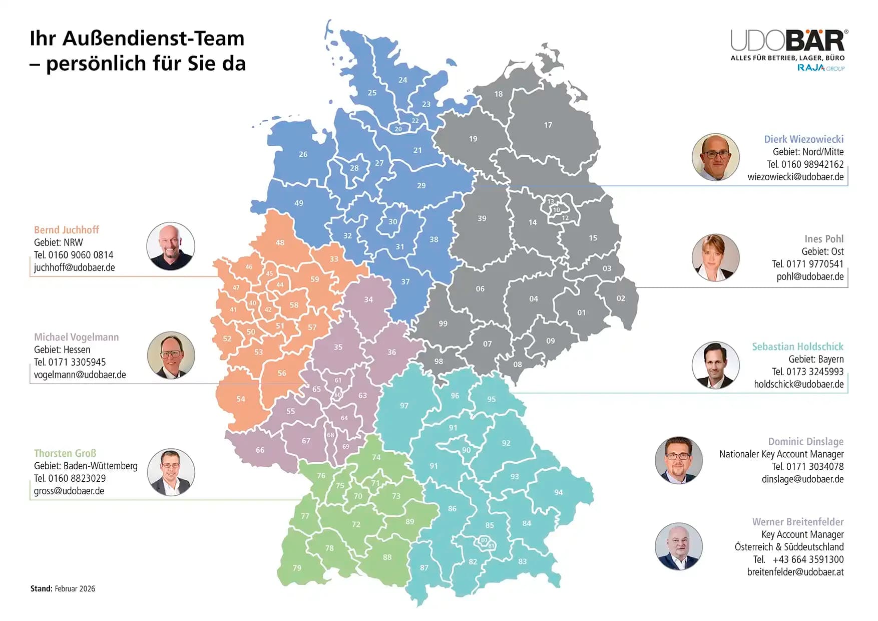 Our team of sales representatives is also available to assist you personally on site with all your purchasing decisions. Whether you are already a customer or would first like to find out more about our product range and services. Take advantage of our many years of experience and consulting expertise to handle even unusual procurement requests more quickly and efficiently. Because UDO BÄR is more than just a catalog or online shop—our team is always there for you when you need us.